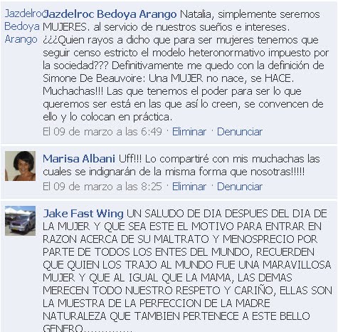 No sólo denota una falta importante en la formación humana, humanística e integral de la Facultad de Ingeniería de la Universidad de Antioquia o al menos en el proponente de la increible frase (Hago la salvedad pues no estoy de acuerdo que por uno paguen todos) sino que nos muestra claramente que pese a los esfuerzos por la equidad, sigue existiendo un arquetipo, prototipo y estereotipo desactualizado de mujer muy arraigado en el inconsciente colectivo que se evidencia constantemente en comportamientos discriminatorios y violentos hacia nosotras y que nos motiva con más ahínco a seguir trabajando en pro de los derechos de las mujeres.