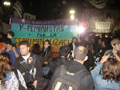 Momentos después de llegar estaba con un grupo de argentinas sosteniendo una valla con la bandera de su país, lo cual inspiró a un periodista que antes de entrevistarme inició con algo como: “Los argentinos estamos aquí en Plaza de Mayo compungidos por la muerte de Kirchner. Por qué estás aquí hoy?” (Aún me hago la pregunta, ¿por qué estaba en ese momento de mi vida en Argentina viviendo esto?) Después de responder y aclarar mi condición de colombiana, turista y de que estaba como mujer apoyando a Cristina, seguí caminando, cuando… vaya sorpresa, una bandera arcoíris entre la multitud blanca y azul. –Que bien!, pensé. Las banderas no son sólo para las marchas del orgullo gay, también se alzan en momentos como estos para expresar apoyo. Que buena manera de visibilizarse!