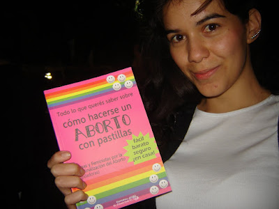 Momentos después me encuentro con un grupo de mujeres portando una bandera más grande y con un mensaje claro, visible y contundente: Lesbianas y feministas por la descriminalización del aborto; las cuales después de saludarlas y demostrarles mi apoyo, me regalaron un libro que también se puede descargar por internet llamado: Todo lo que querés saber sobre cómo hacerse un aborto con pastillas de la editorial El Colectivo. En su portada y contraportada aparecen frases como estas: