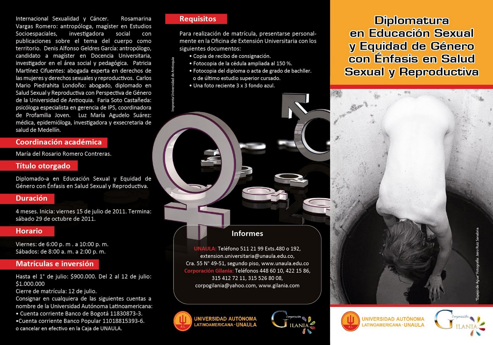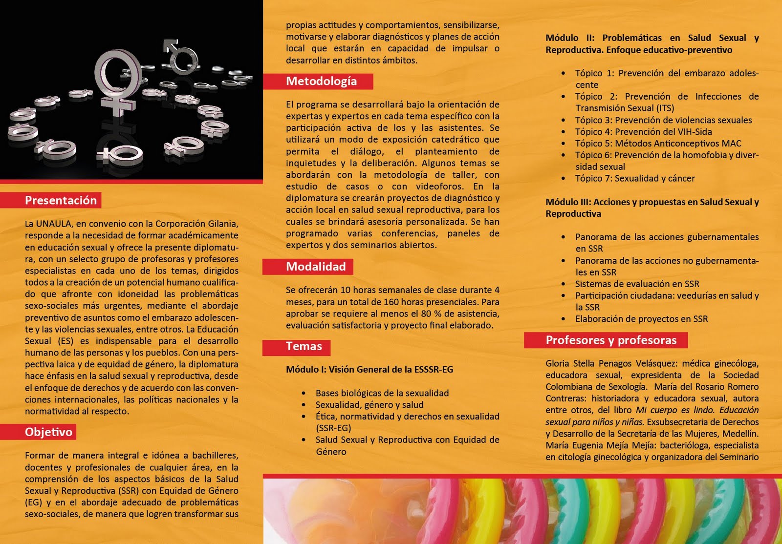 La UNAULA en convenio con la Corporación Gilania, responde a la necesidad de formar académicamente en educación sexual y ofrece el diplomado en educación sexual y equidad de género con énfasis en salud sexual y reproductiva (ESSSR-EG), con un selecto grupo de profesoras y profesores especialistas en cada uno de los temas, dirigidos todos a la creación de un potencial humano cualificado que afronte con idoneidad las problemáticas sexo-sociales más urgentes mediante el abordaje preventivo de asuntos como el embarazo adolescente y las violencias sexuales, entre otros. La educación sexual es indispensable para el desarrollo humano de las personas y los pueblos. Con una perspectiva laica y de equidad de género, el Diplomado ESSSR-EG 2011, hace énfasis en la salud sexual y reproductiva, desde el enfoque de derechos y de acuerdo con las convenciones internacionales, las políticas nacionales y la normatividad al respecto.